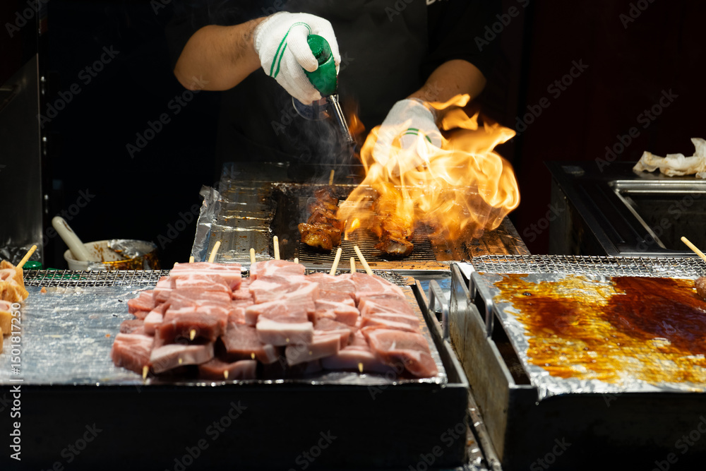 Street food vendor with focused mood grilling skewers over open flame, Seoul, South Korea, Myeongdong Market backdrop