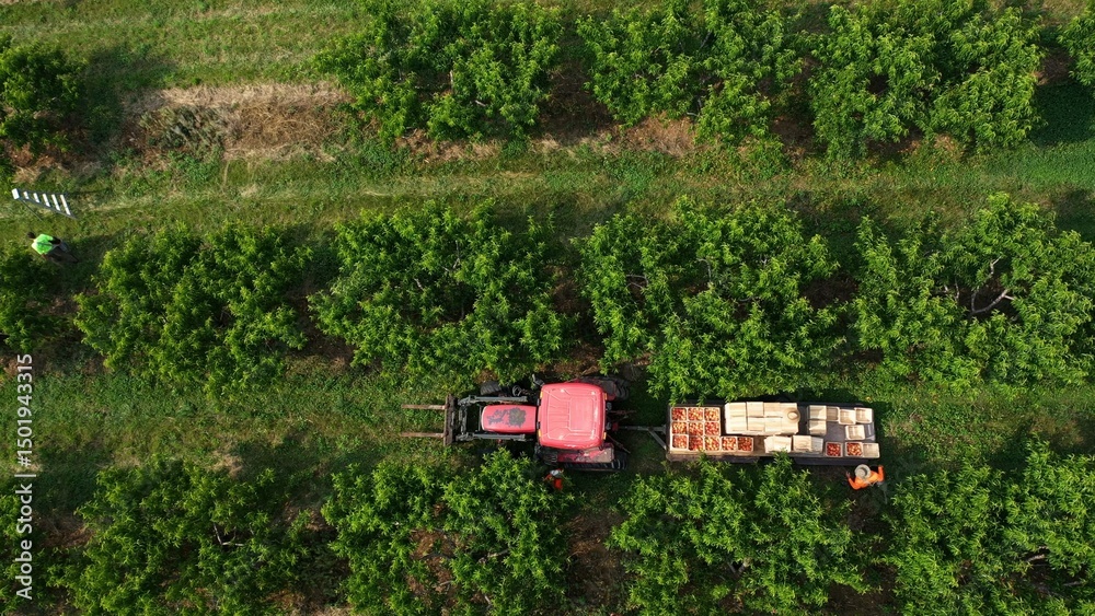 Aerial view of camera descending on tractor pulling a trailer full of peaches as farmers pick fruit from the trees during the harvest.