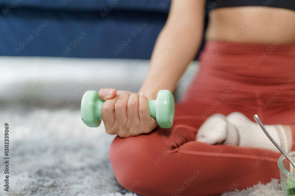 Close up of a woman's hand holding a light dumbbell while sitting on the floor at home, suggesting a focus on fitness and healthy lifestyle