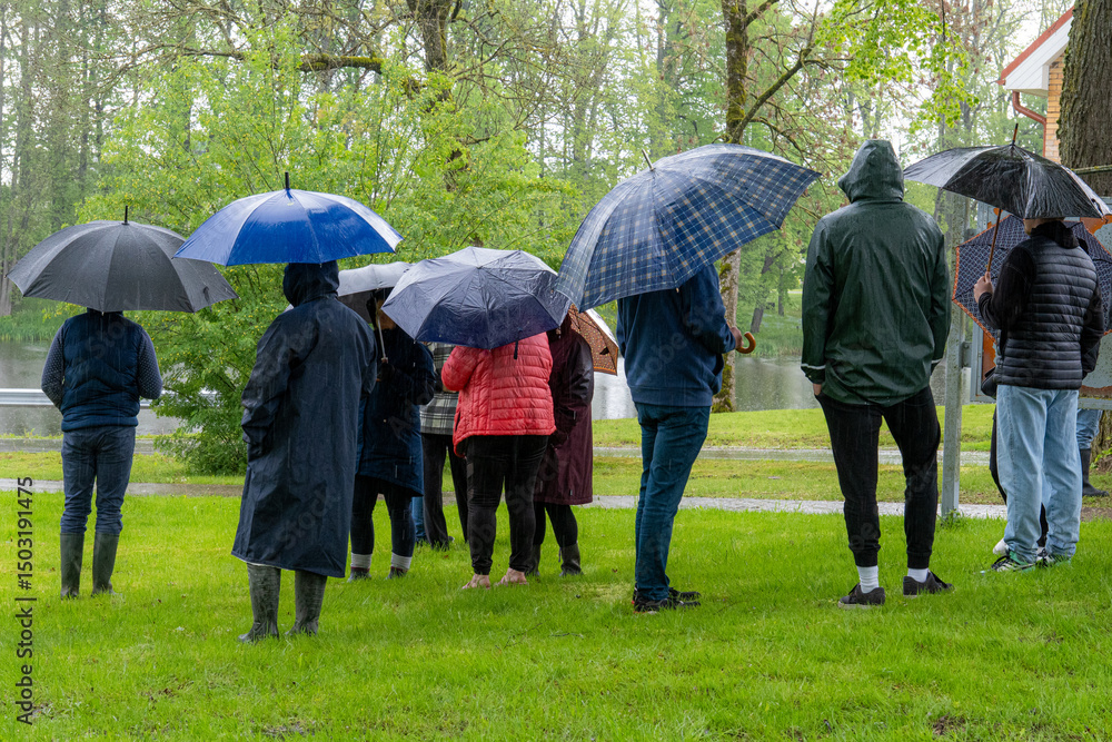 Group of people standing in rain under colorful umbrellas on green grass during public outdoor event or gathering near river in spring weather