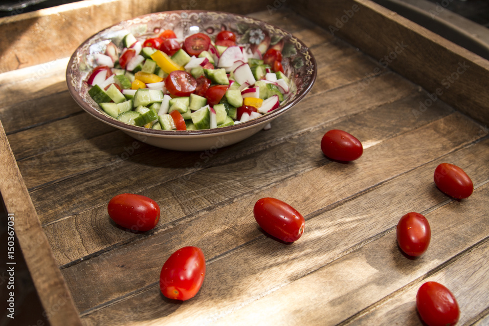 bowl with vegetable spring cut salad, tomato, pepper, radish, cucumber