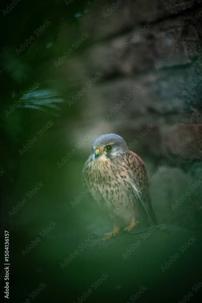 männlicher Turmfalke sitzt im Gebüsch, Greifvogel sitzt vor einer Mauer in der Stadt, Jäger der Großstadt, Jungtier im Mai