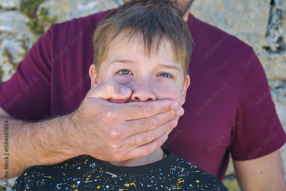 Adult hand covering young boys mouth, boy gazing at camera with distressed expression, concept of family problems, suppression, communication issues