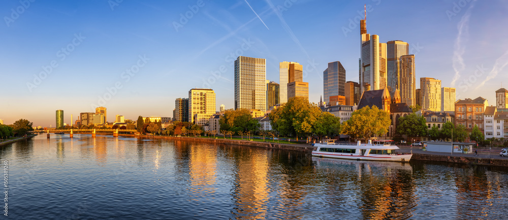 Golden sunrise view of the skyline of Frankfurt, Germany, with banking skyscrapers and reflections in the River Main