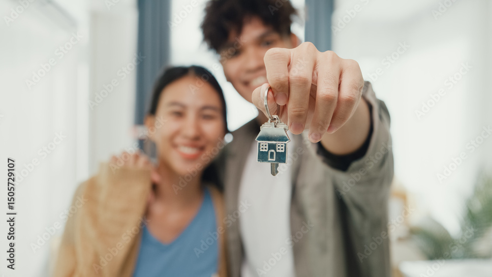 Close-up Young happy Asian sweet couple hug each other smiling looking at camera so proud show off new house keychain in living room. Husband wife move new home, Apartment Rent And Ownership Concept.
