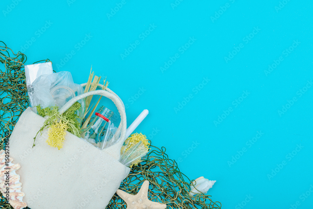 World Oceans Day concept. Fishing net, sea star, shells, and reusable linen bag filled ocean waste