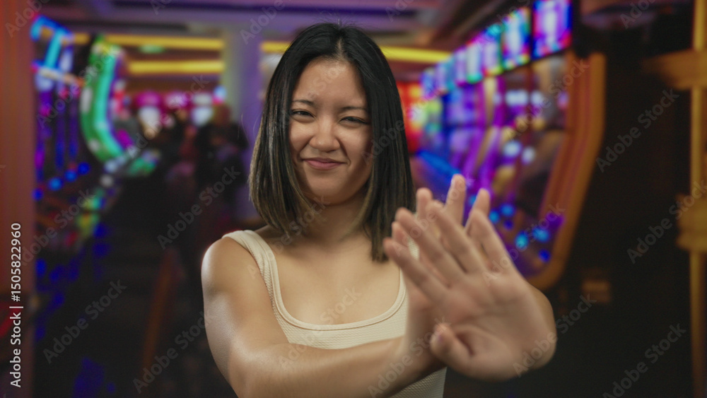 Woman showing rejection gesture in vibrant casino setting with colorful slot machines in the background, capturing a moment of displeasure indoors.