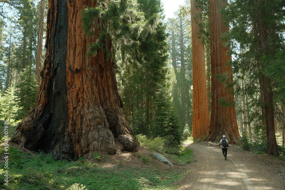Hiker tourist walking through Ancient giant sequoia trees (Sequoiadendron giganteum) at Mariposa Grove in yosemite national park