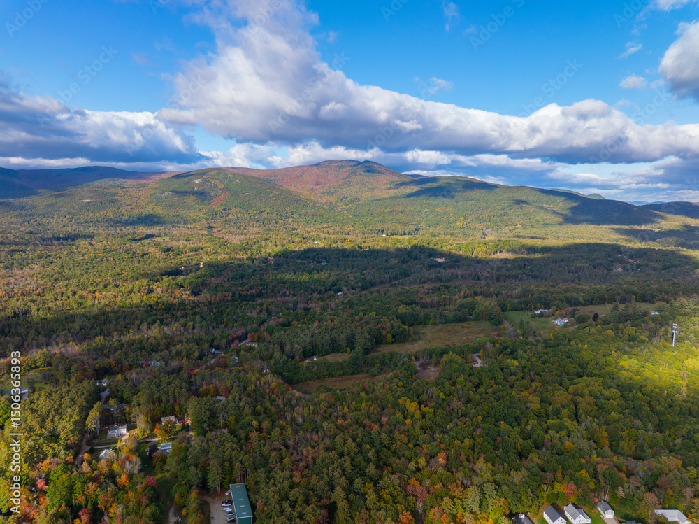 Ossipee Mountains aerial view in fall from top of Melvin Village, Tuftonboro town, New Hampshire NH, USA.