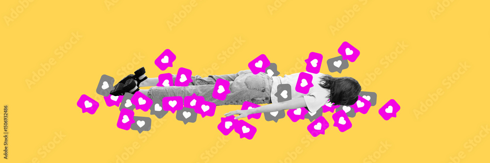 Like Overdose. Young woman lies exhausted on floor surrounded by floating like icons in pink and grey tones. Concept of social media, burnout, validation, addiction. Contemporary art collage