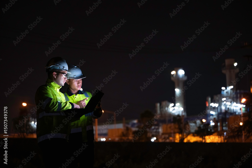 Industrial engineer night inspection at refinery or petrochemical plant walkie-talkie hand and digital tablet intersection of technology, worker work at night at power plant