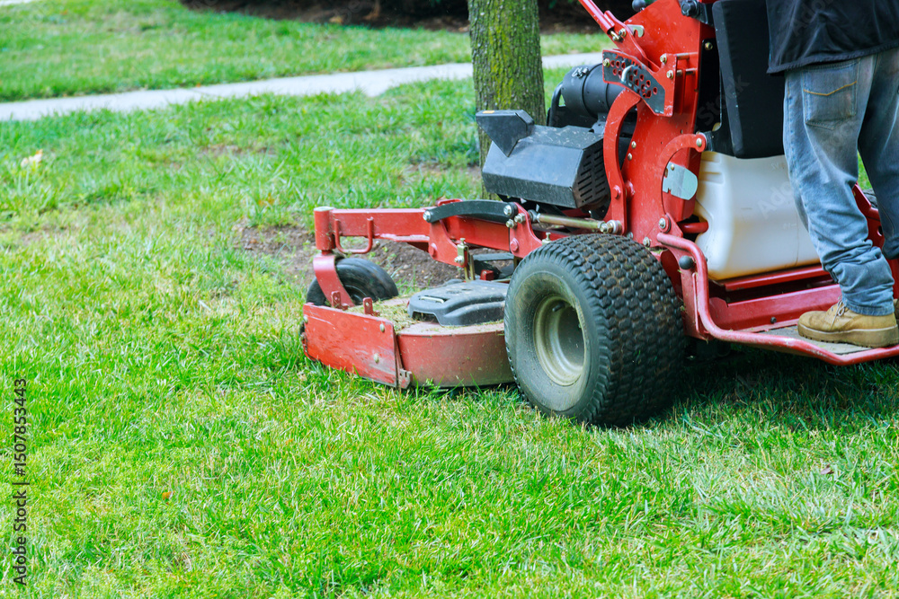 Lawn maintenance process is underway as grass trimming equipment cleans up neat yard in suburban neighborhood.
