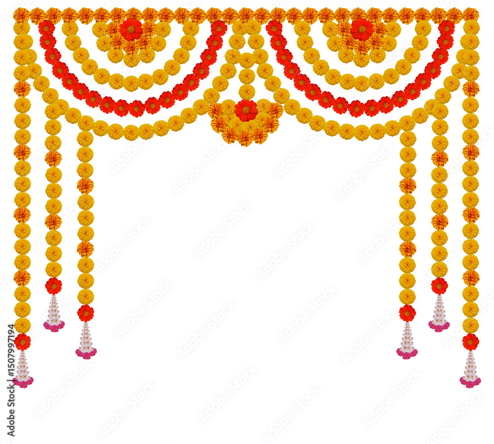 Marigold flower garland decoration backdrop for wedding decor, Happy Diwali, Indian Holiday festival isolated on transparent background