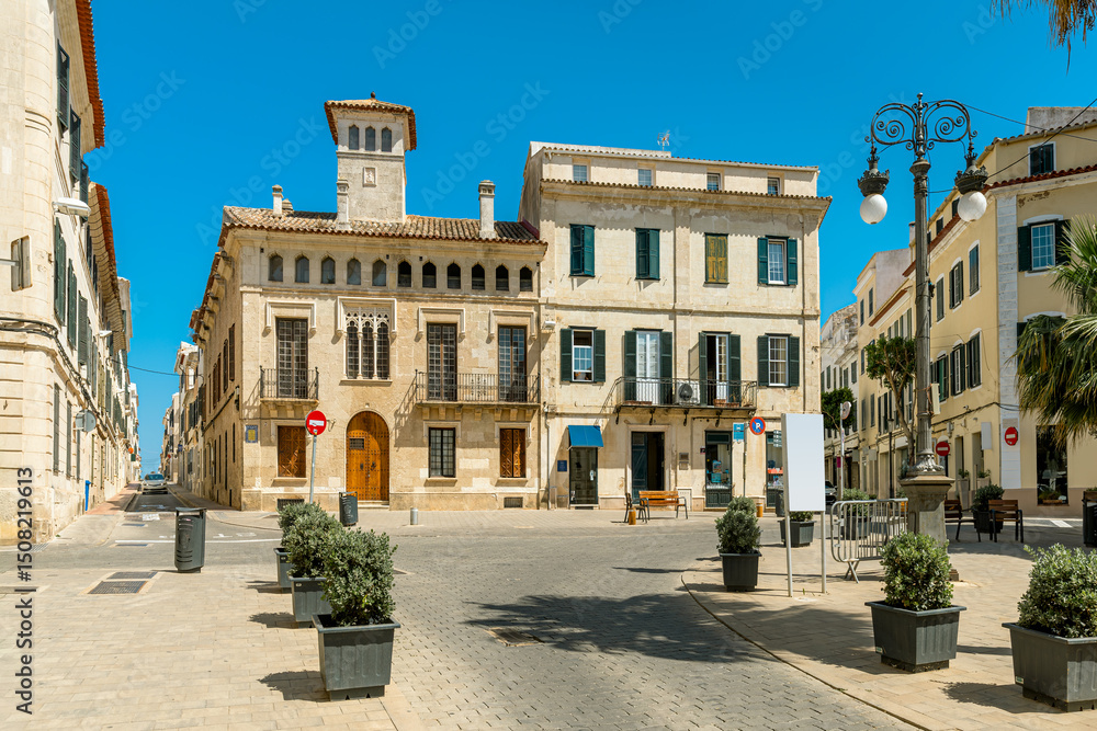 Historic architecture under a blue sky on a small town square in Mahon, Spain.