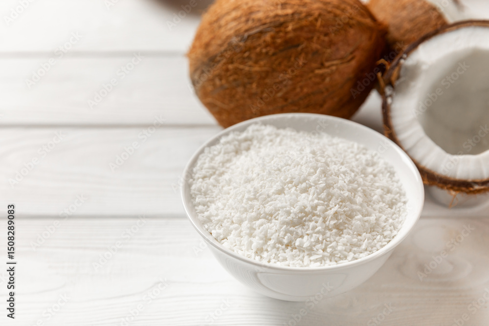 Set of fresh whole and half coconuts and slices on wooden background. Coconut flakes. Vegan. Tropical nut, fruit. Place for text. Copy space.
