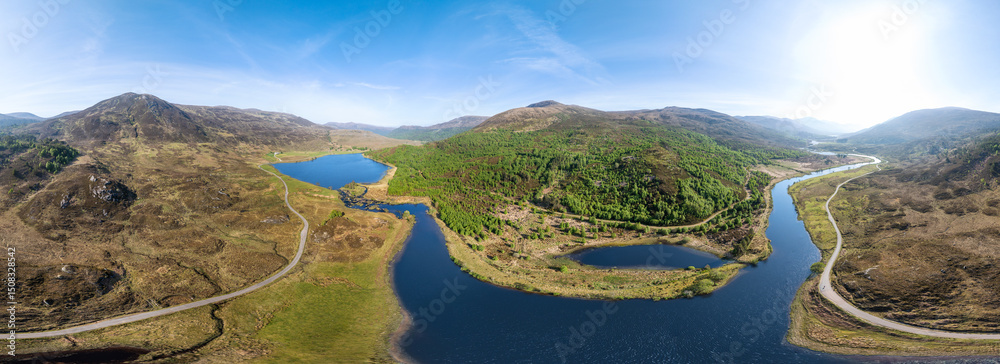 aerial view of Loch Carrie, Loch Sealbhanach and Loch Mullardoc, a water reservoir with hydro electric power station in a side Valley of Glen Affric ind the highlands of northern Scotland, UK