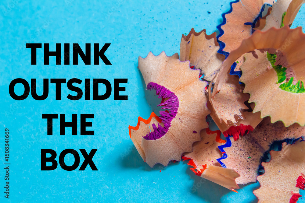 Think outside the box message written on blue background. Conceptual think outside the box symbol. Copy space.
