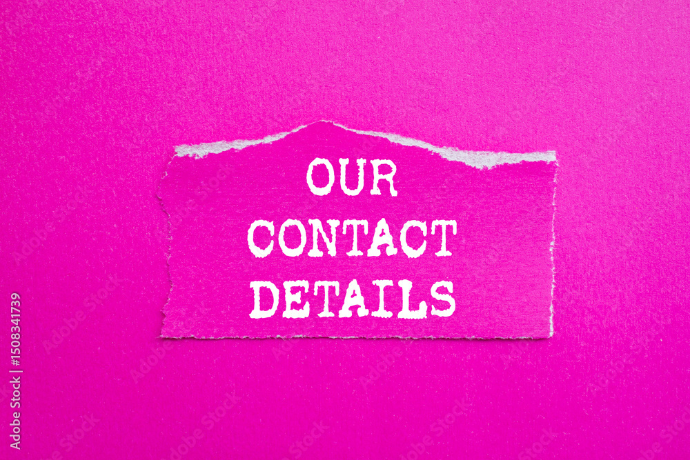 Our contact details message written on ripped torn pink paper piece on pink background. Conceptual our contact details symbol. Copy space.