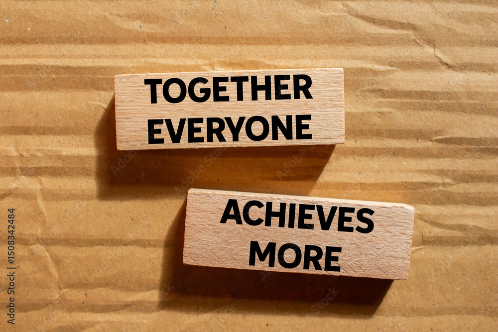 Together everyone achieves more message written on wooden blocks on cardboard background. Conceptual together everyone achieves more symbol. Copy space.