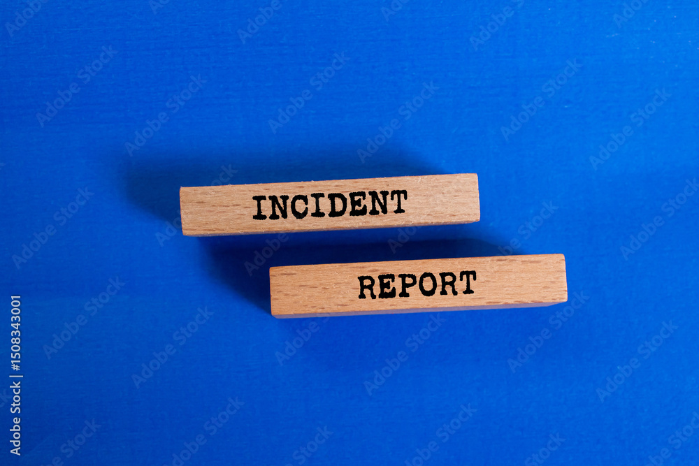 Incident report message written on wooden blocks on blue background. Conceptual incident report symbol. Copy space.