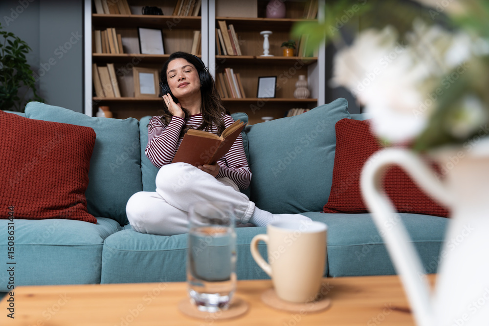 Happy young woman relaxing on comfortable sofa reading interesting book and listening to music with headphones, enjoying leisure time at home. Simple living life goals, weekend activities concept.
