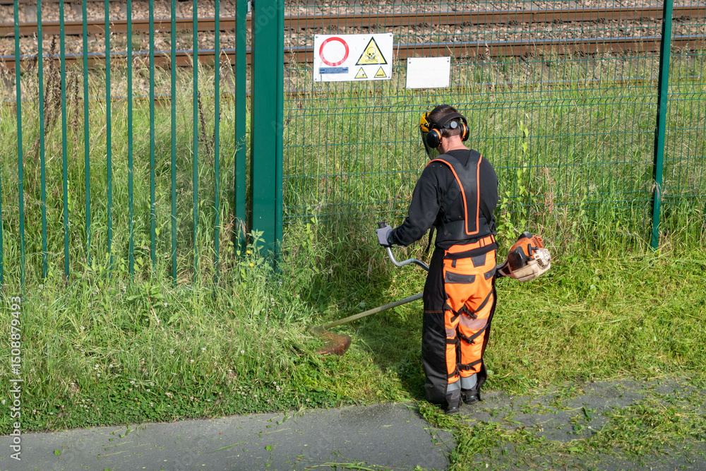 Trabalhador de moto-roçadora a cortar erva na berma de uma estrada para limpeza do local