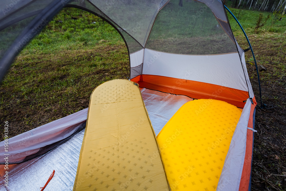 Enjoy a cozy camping setup with two comfy air mattresses in a spacious tent, surrounded by natures beauty, perfect for outdoor adventures and unforgettable memories with loved ones