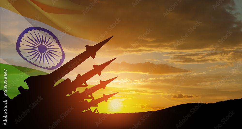 The missiles are aimed at the sky at sunset with Indian flag. Nuclear bomb, chemical weapons, missile defense.