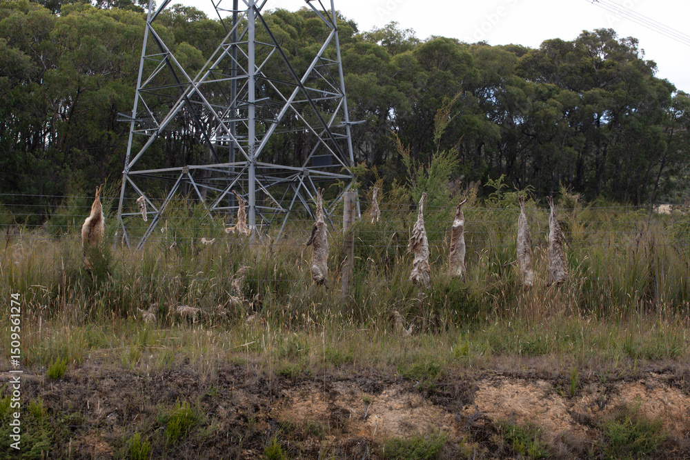 Dead Wild dogs strung up on a barbwire fence in regional Australia, with power line in background.