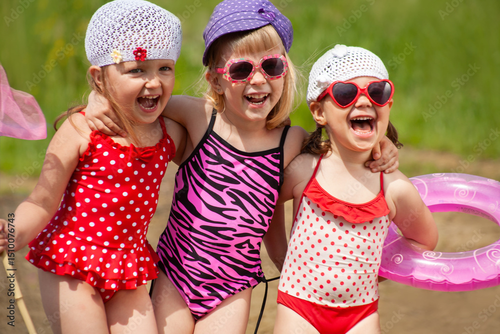 Little girls in bathing suits have fun during summer time on the lake beach.