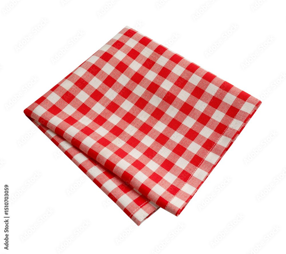 Red checkered cloth,picnic folded towel isolated on white.Food decor design element.Dishcloth.