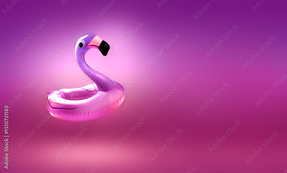 Pink flamingo float and empty copy space background,summer resort travelling concept, sea vacation backdrop.Promotional stage,banner.Product advertisement platform.