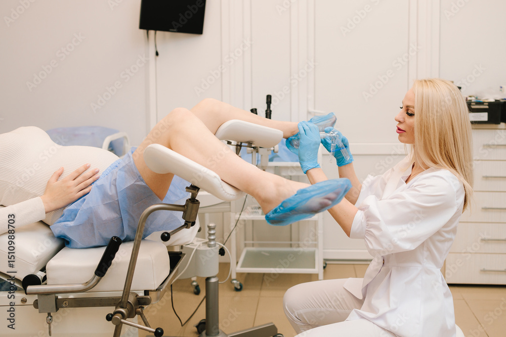 Gynecologist makes exam of pregnant woman on the examination chair. Gynecologist takes a vaginal swab for bacterial examination in the clinic.