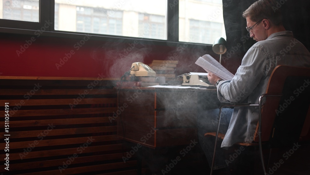 Male novelist deep in creative thought, vintage office with typewriter and papers in cinematic soft focus.