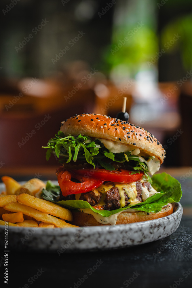 delicious beef burger with fresh vegetables, and sesame bun, served with golden fries, ideal for food and restaurant visuals