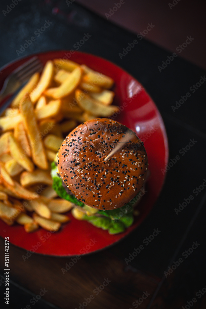 delicious beef burger with fresh vegetables, and sesame bun, served with golden fries, ideal for food and restaurant visuals