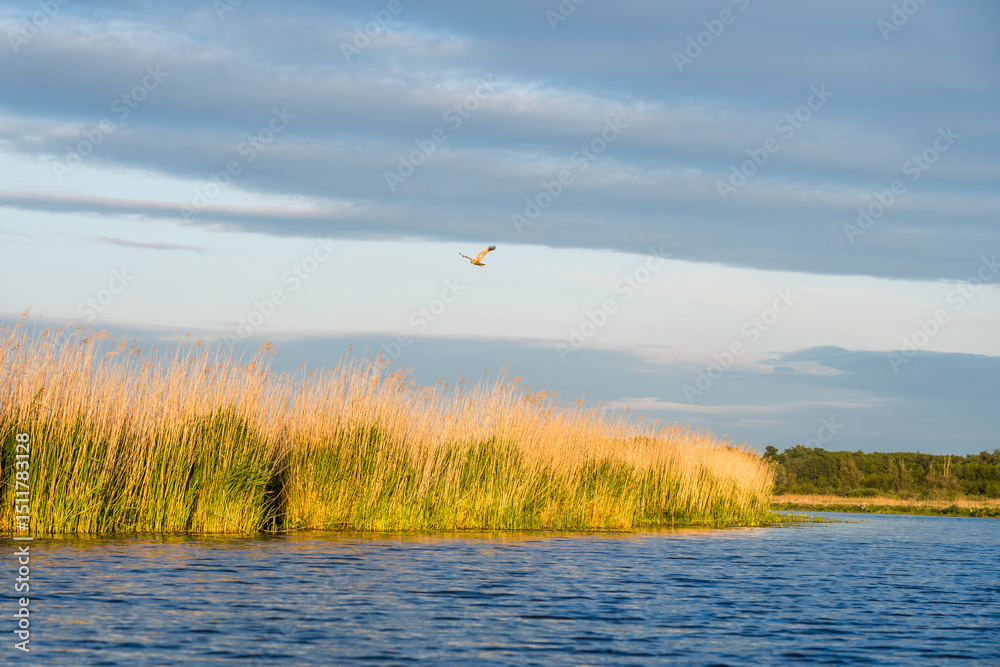 Common Buzzard Flying at Sunset over the Wide Trebel River with Reeds and Darkening Sky