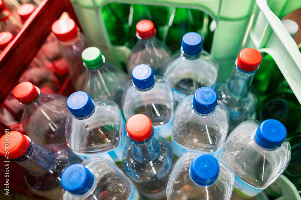 Leere Pfandflaschen und Getränkekisten. Symbolisiert Recycling, Umweltschutz, Mehrwegsystem, Pfandsystem und nachhaltigen Konsum in Deutschland.