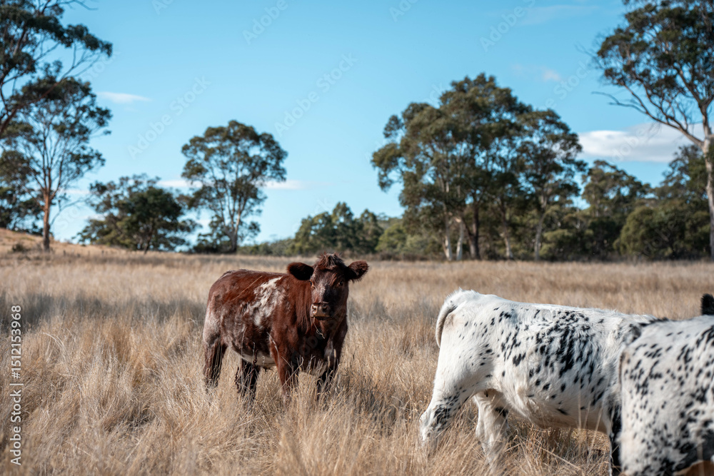 Carbon neutral cattle farming in a free range field on a farm in Australia beautiful cattle in Australia eating grass, grazing on pasture. Herd of cows free range beef being regenerative raised