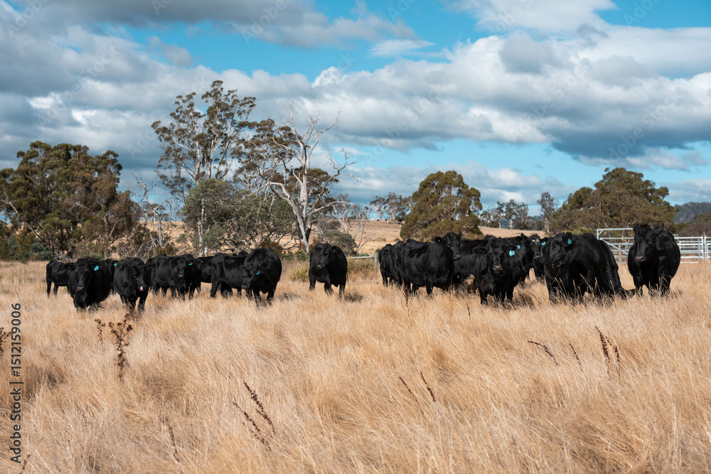 Carbon neutral cattle farming in a free range field on a farm in Australia beautiful cattle in Australia eating grass, grazing on pasture. Herd of cows free range beef being regenerative raised