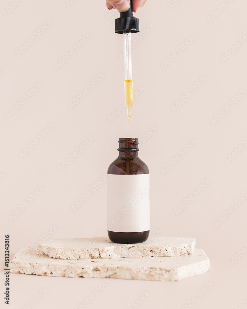 Glass amber dropper bottle on tan background with natural stones and blank label with dropper dripping oil