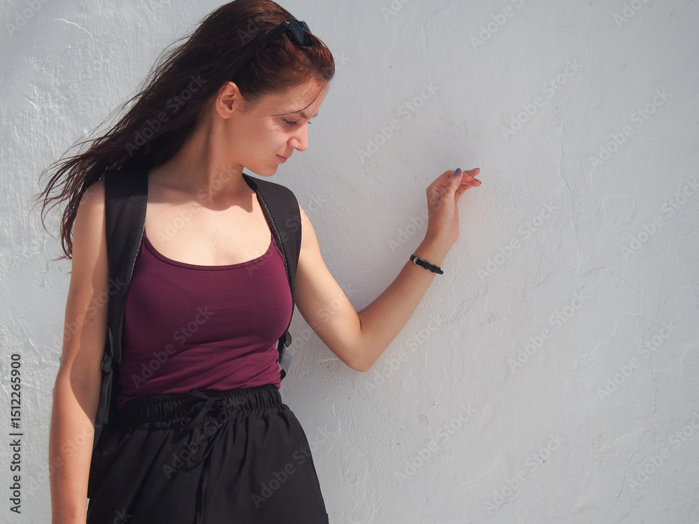 A young 30-year-old tourist woman, summer dress, standing alone. Young caucasian woman. Brunette girl, naturalness.