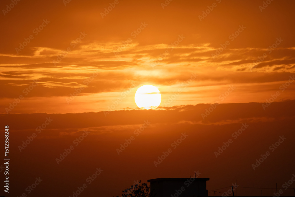 Fiery red sunset sky background. Beautiful, colorful, dramatic clouds at sunset or sunrise.