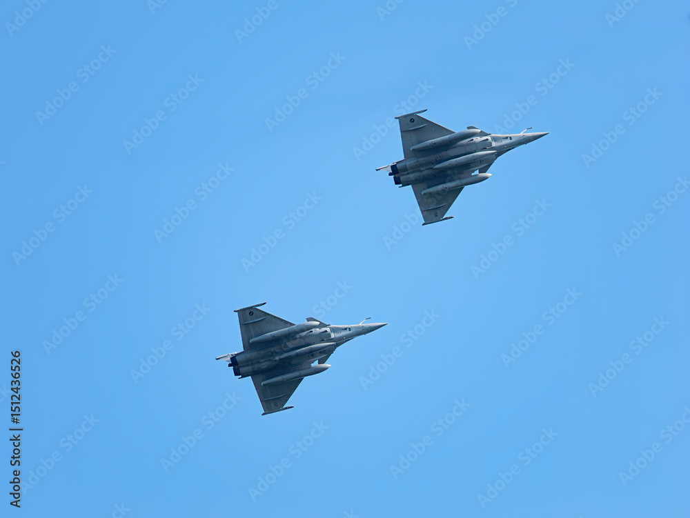 Close-up photo of two powerful Dassault Rafale fighter jets in a dynamic low-angle shot, soaring through a clear blue sky above the town of Zagreb, Croatia