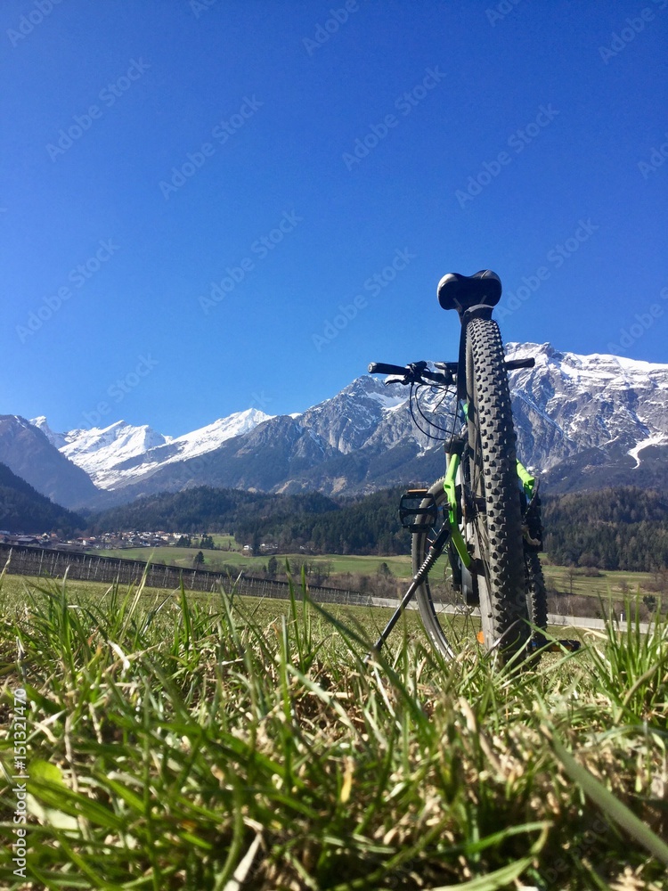 Mountainbike vor schneebedeckten Berggipfeln in den Alpen