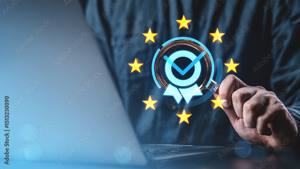 Man analyzing digital compliance icon with EU stars on screen using magnifying glass.