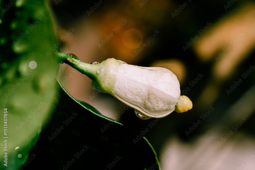 Close up of unopened citrus flower buds covered in water droplets. Gentle natural lighting and dark background highlighting fresh texture and raindrops on delicate white buds