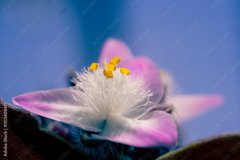 Close-up of Tradescantia sillamontana flower with soft pink petals, white hairy filaments, and bright yellow anthers. Shallow depth of field with dreamy bokeh background