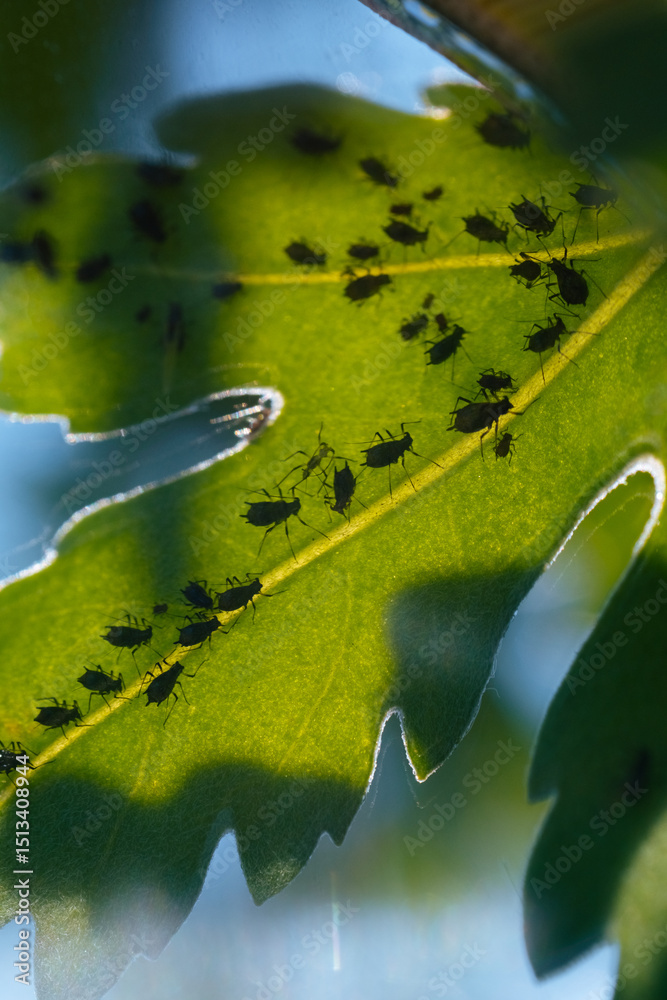 Silhouettes of aphids crawling on a backlit green leaf. Macro photo showing light and shadow through leaf veins and small insect bodies