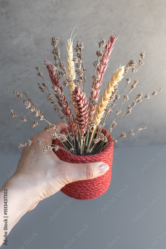 Wheat decor. Ukrainian souvenir. Symbol of life. Do-it-yourself amulet. Craft production. Composition of dried flowers. Colored spikelets. Lavender in a bouquet. Gift instead of flowers.